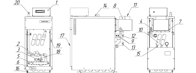 12. Место отбора проб уходящих газов 13. Патрубки отопления (подача) 14. Патрубки отопления (обратка) 15. Транспортировочные проушины 16. Сливная пробка 17. Дверка 18. Глазок для контроля пламени 19. Предохранительный клапан 20. Штуцер для замера давления газа 21. Регулятор давления газа . |