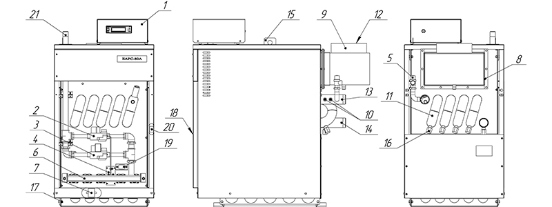 12. Место отбора проб уходящих газов 13. Патрубки отопления (подача) 14. Патрубки отопления (обратка) 15. Транспортировочные проушины 16. Сливная пробка 17. Место заземления 18. Дверка 19. Окошко для контроля пламени 20. Ионизационный датчик пламени 21. Патрубок присоединения газа . |